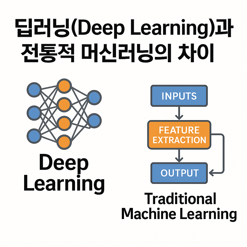 | 대표 알고리즘 | SVM, KNN, 결정트리 등 | CNN, RNN, GAN 등 |